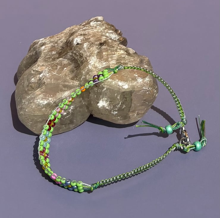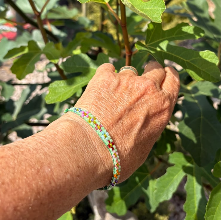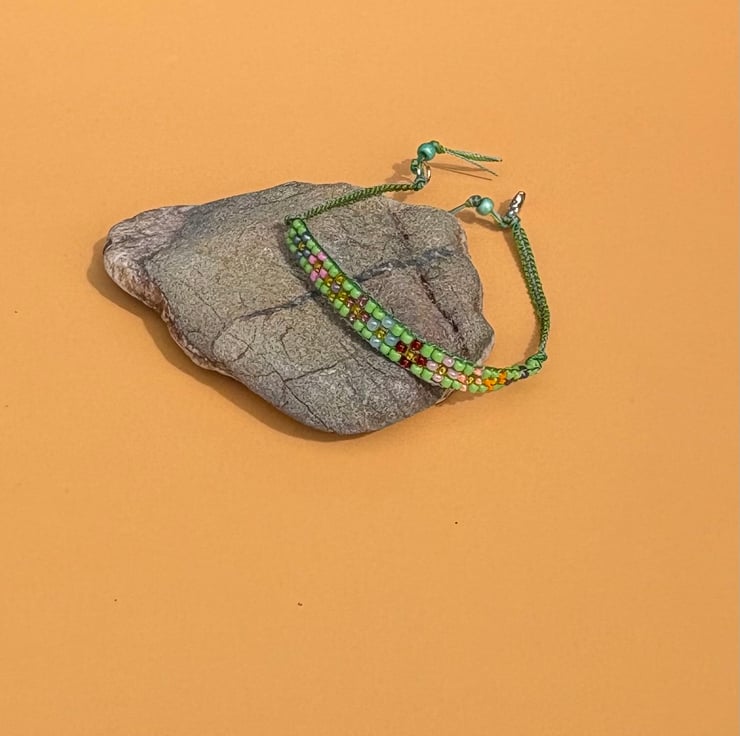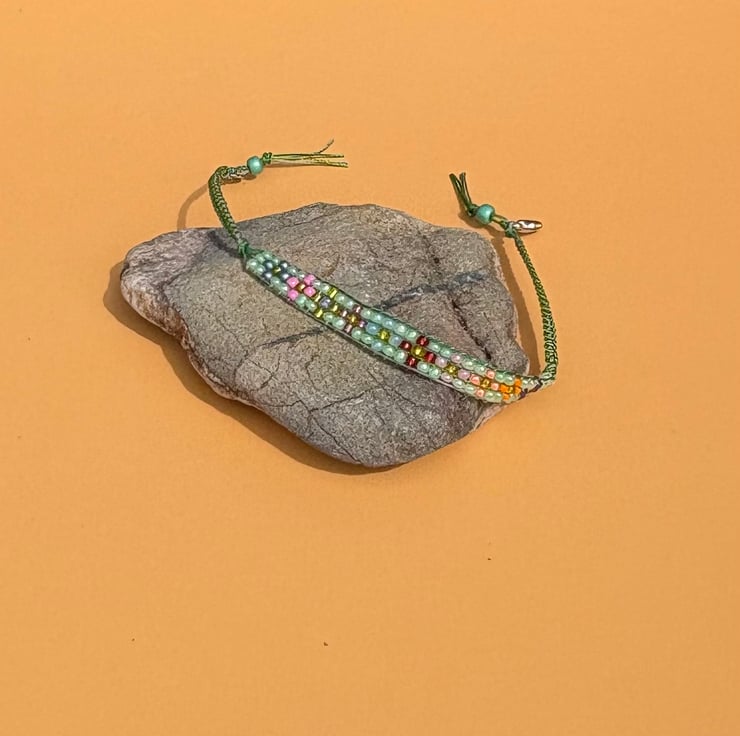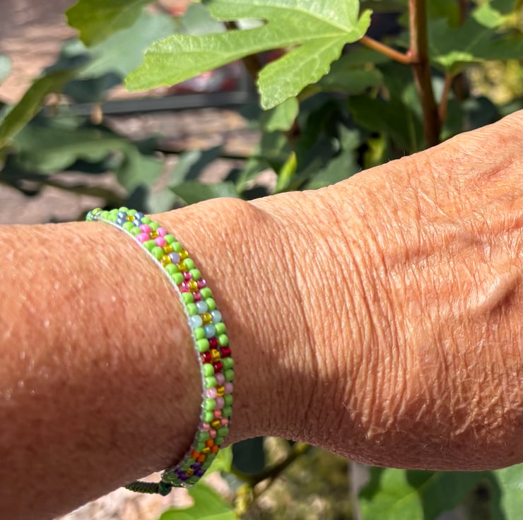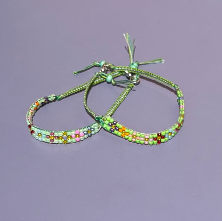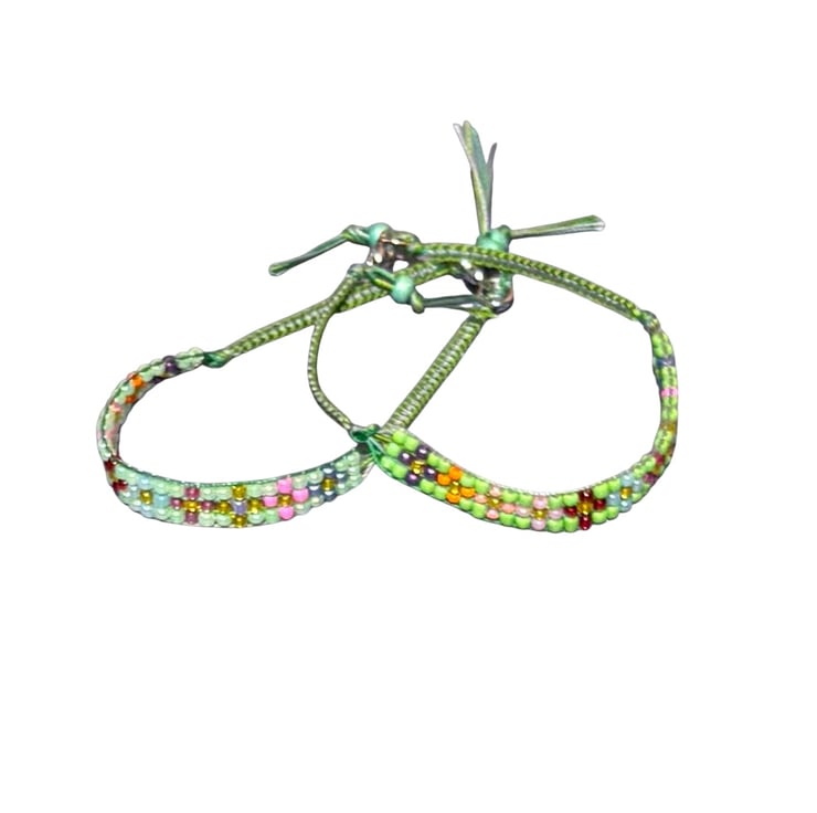 These pretty bracelets are hand woven on a bead loom with 3 rows of glass seed beads creating a colourful pattern. The waxed thread warp strings have been braided at each end using a square knot macrame technique and fastened with a lobster claw clasp and ring.
