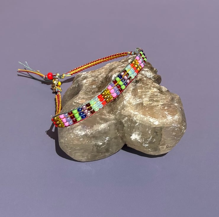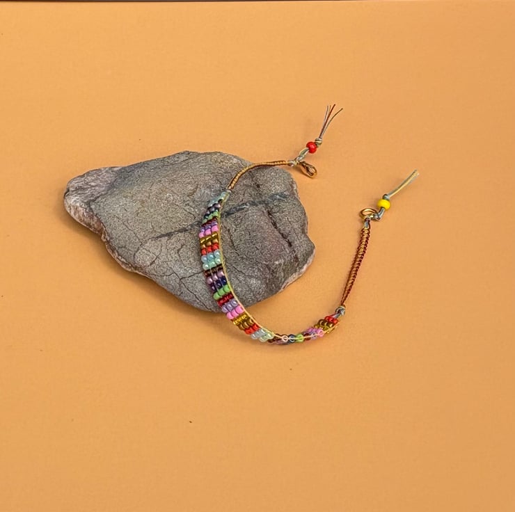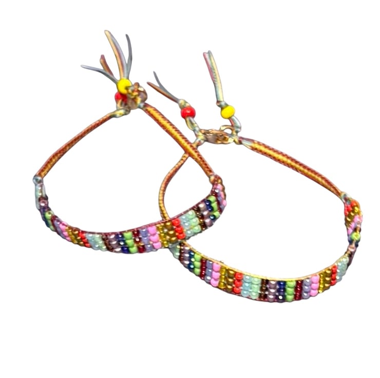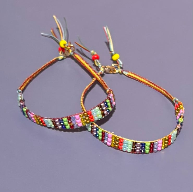 These pretty bracelets are hand woven on a bead loom with 3 rows of glass seed beads creating a colourful pattern. The waxed thread warp strings have been braided at each end using a square knot macrame technique and fastened with a lobster claw clasp and ring.