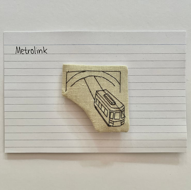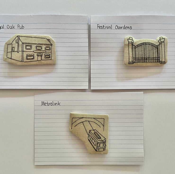 Each features an intricately hand-stitched landmark from the area in black thread on tan cotton fabric. Each piece is securely fastened with a brooch pin so it may be worn but they could also easily be mounted for hanging.
