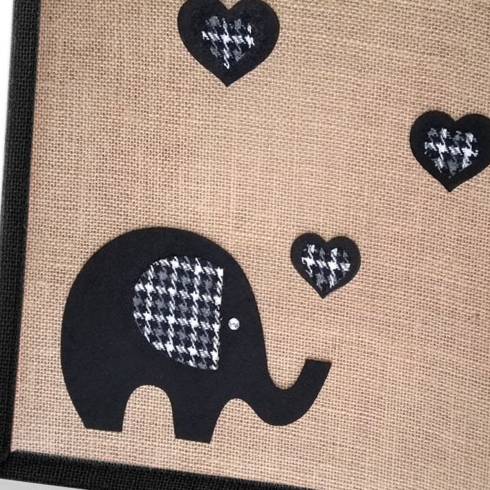 Embellished with a black felt and houndstooth fabric elephant and hearts.