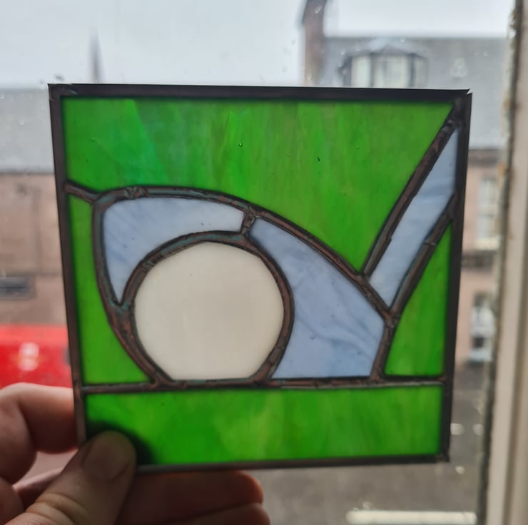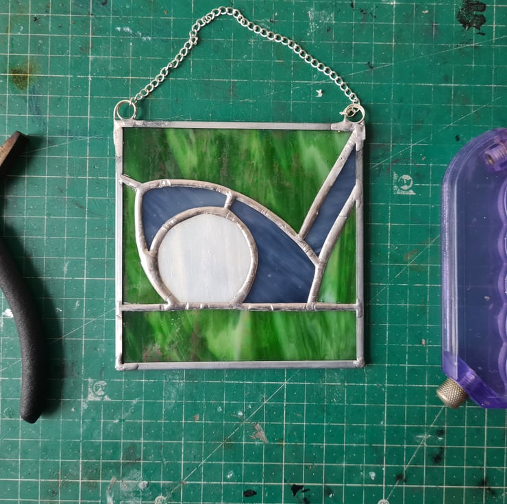 This mini panel is inspired by the rich Golfing heritage here in Scotland. This panels shows a 5 iron and golf ball, using a vibrant iridescent green glass. Made using the Tiffany method it is delicate to look at but made to last and will enchant you for years to come