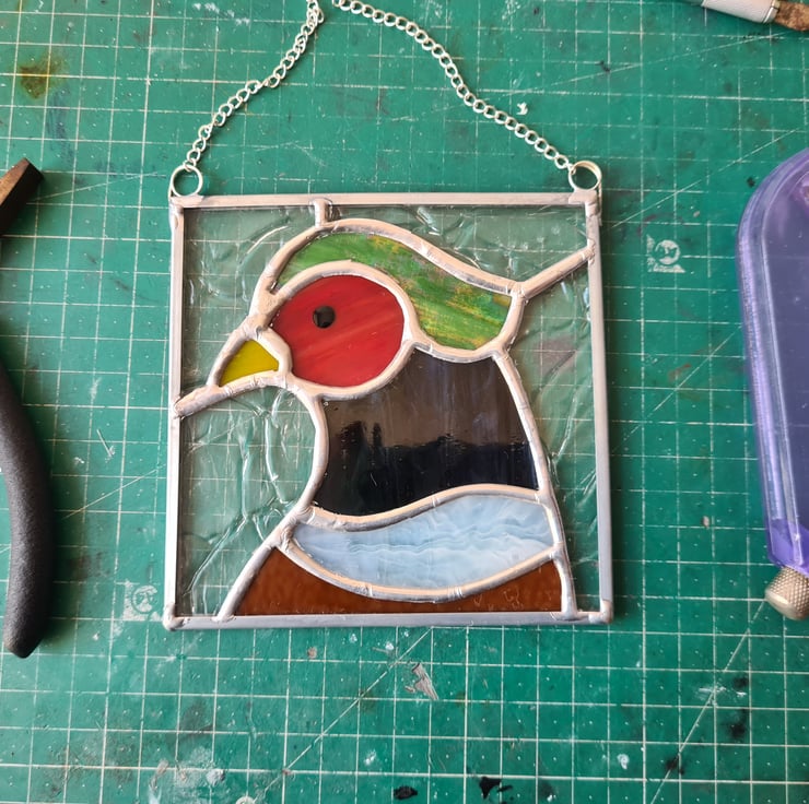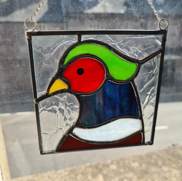 This mini panel shows a portrait of a pheasant, using a mixture of glass to capture the essence of this native bird. Made using the Tiffany method it is delicate to look at but made to last and will enchant you for years to come. Measuring 12x12cm approx. Hanging chain included