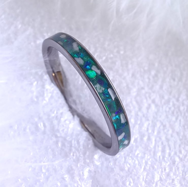These rings are made using a tungsten carbide core which is a very hard wearing and tarnish proof metal. You provide no more than a teaspoon of ashes and choose the colour of the opals you wish me to mix the ashes with in the inlay section of the ring. The inlay is then covered with a tough resin.
