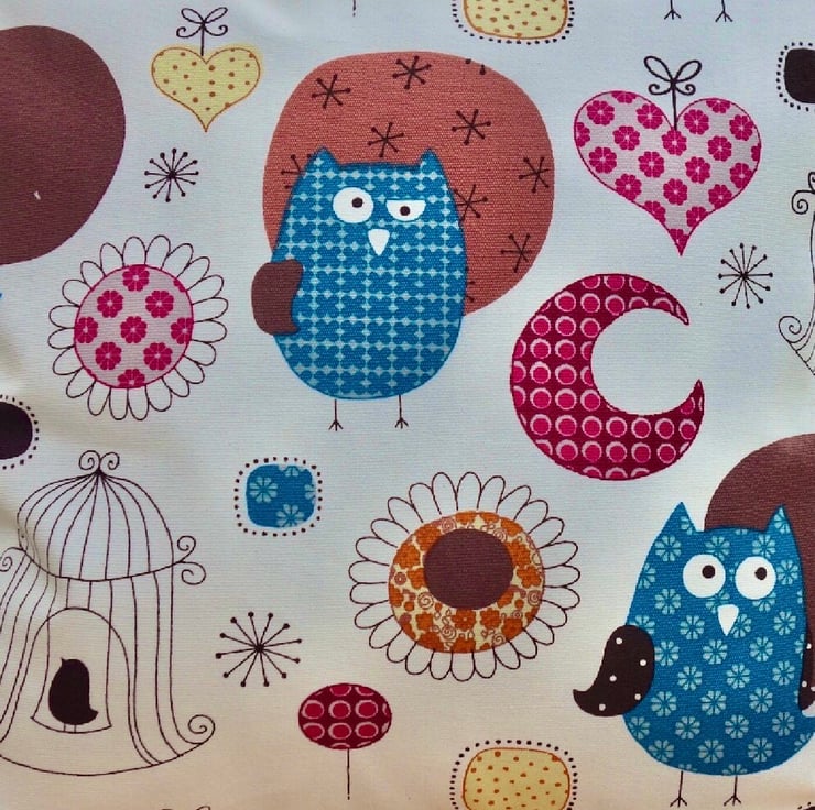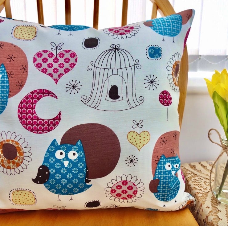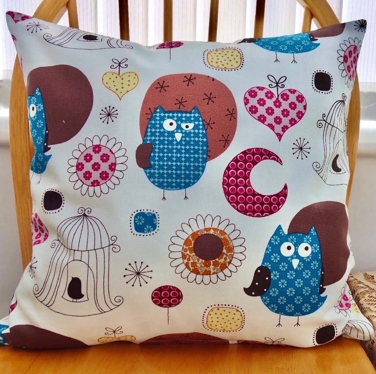 Blue Owls with multi patterned design on a Cream background, double sided Cushion.