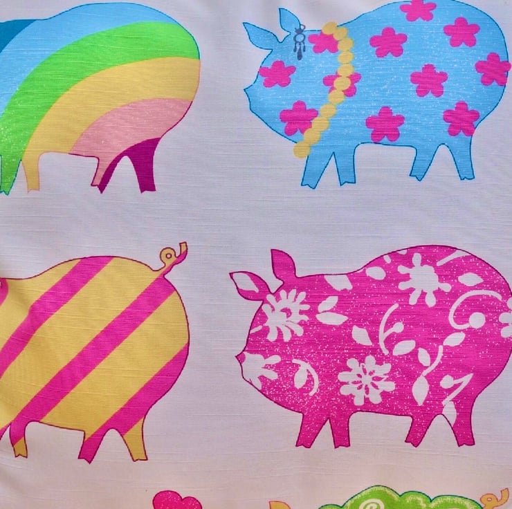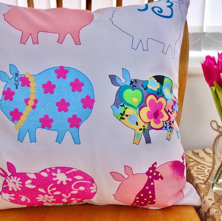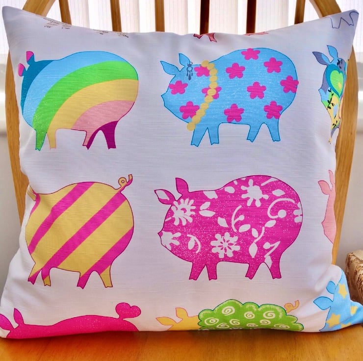 Bright multi coloured and patterned Pigs design on a Cream background, double sided Cushion.