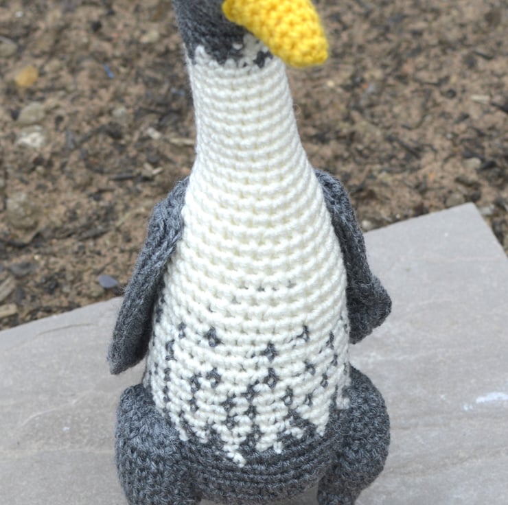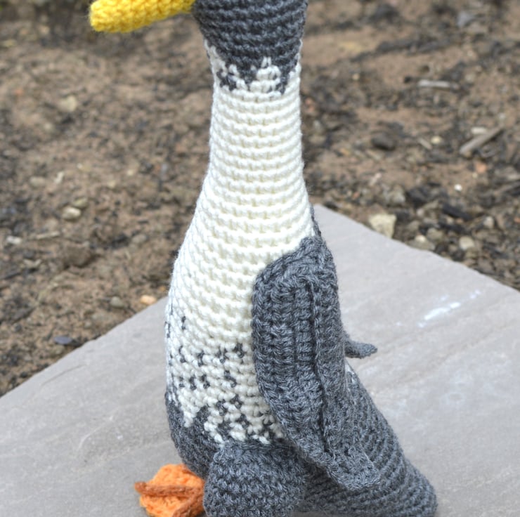 Cute, realistic crochet Runner Duck in off white & grey. This is made in a mixture of merino, acrylic & cotton yarn. The filling is 100% polyester, it is fitted with safety eyes & the legs contain plastic craft tubing. The duck stands about 27 cm tall. This item is not suitable for a child under 3 years old as it contains small items (safety eyes & plastic tubing).