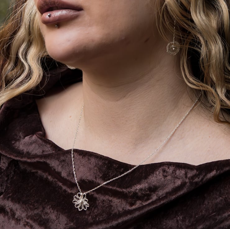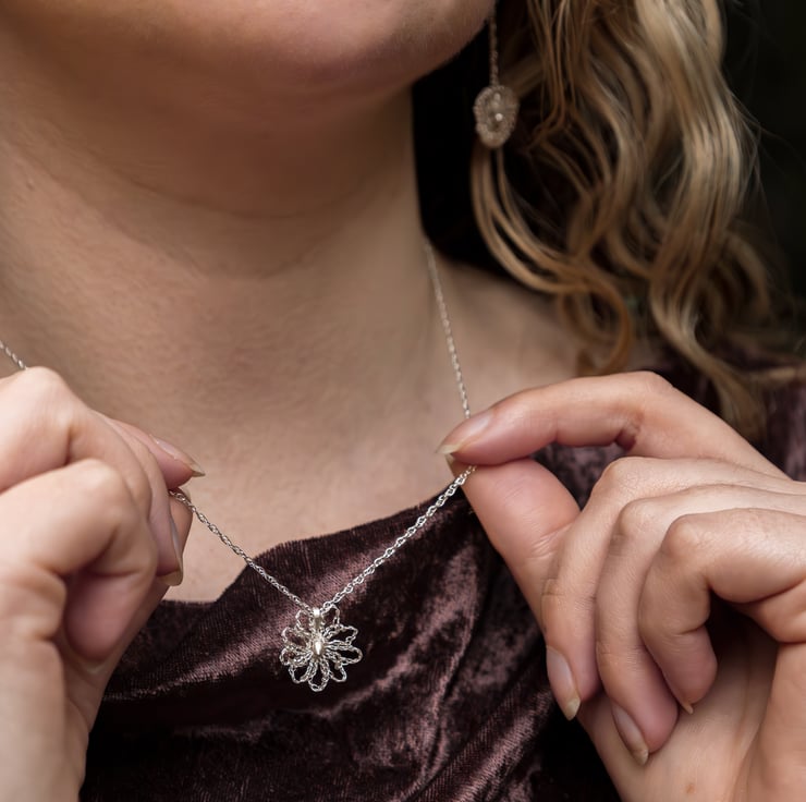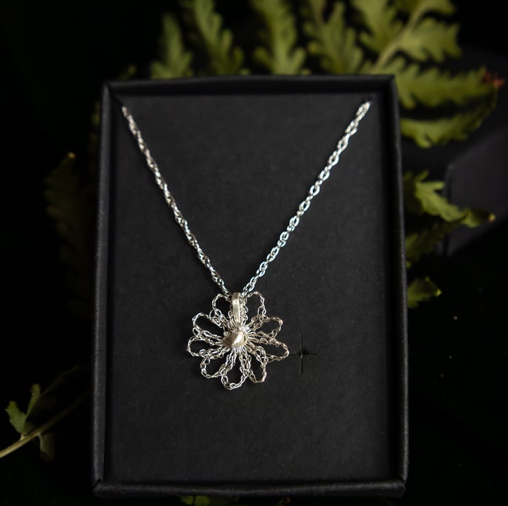 Small, elegant, and strong - this daisy pendant has been crocheted using recycled fine silver and antique hand tools.