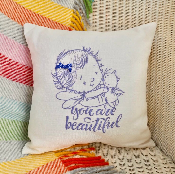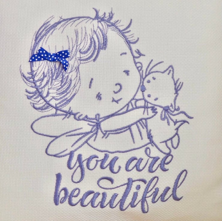 Handmade in a Light Cream fabric, machine embroidered with a child holding a cat in Blue thread, and the words: You are beautiful. Decorated with a Blue ribbon bow.