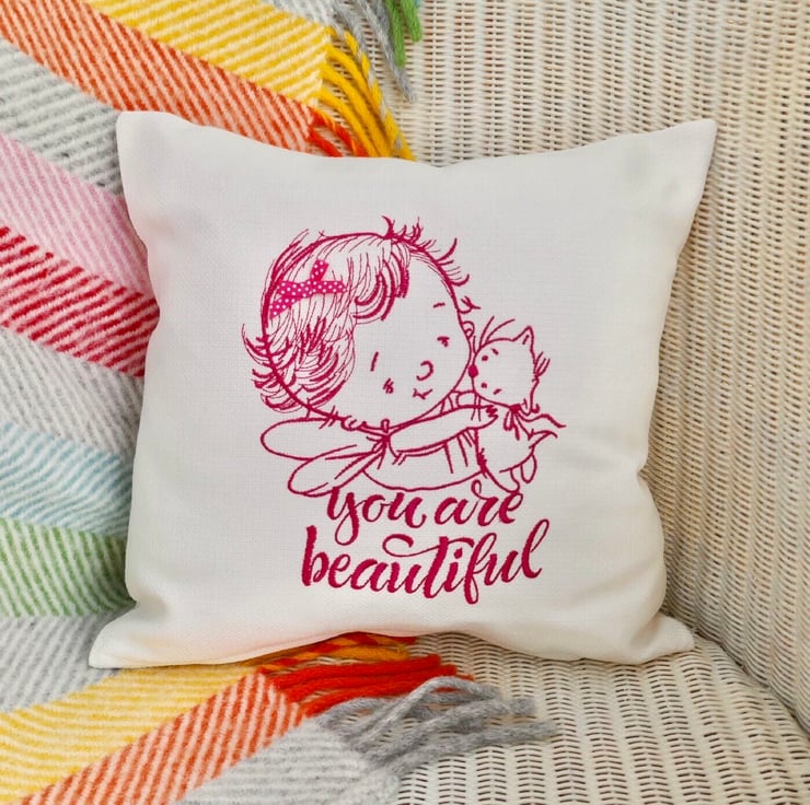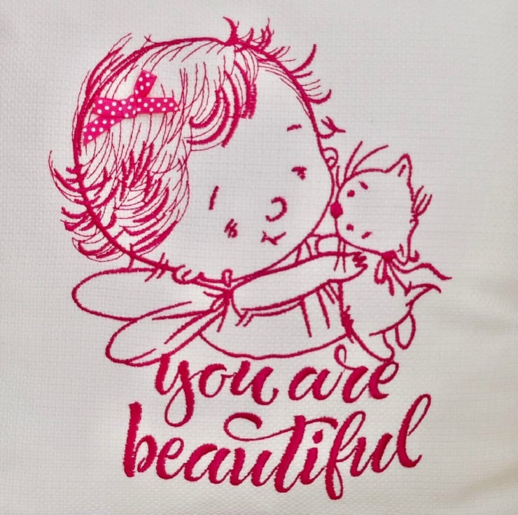 Handmade in a Light Cream fabric, machine embroidered with a child holding a cat in Pink thread, and the words: You are beautiful. Decorated with a Pink ribbon bow.