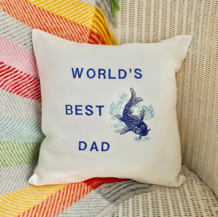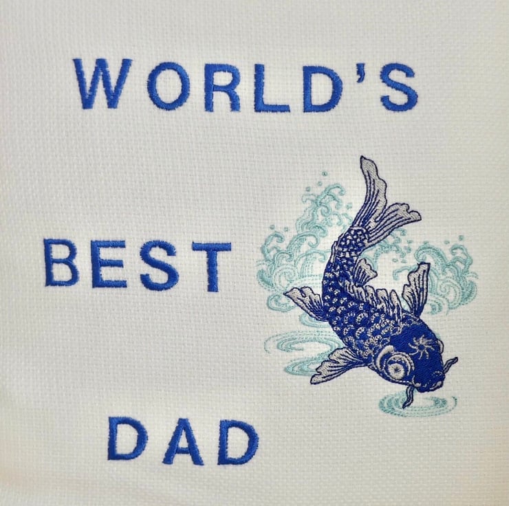 Handmade in a Light Cream fabric, machine embroidered with a Koi Carp and the words: World’s Best Dad in shades of Blue thread.