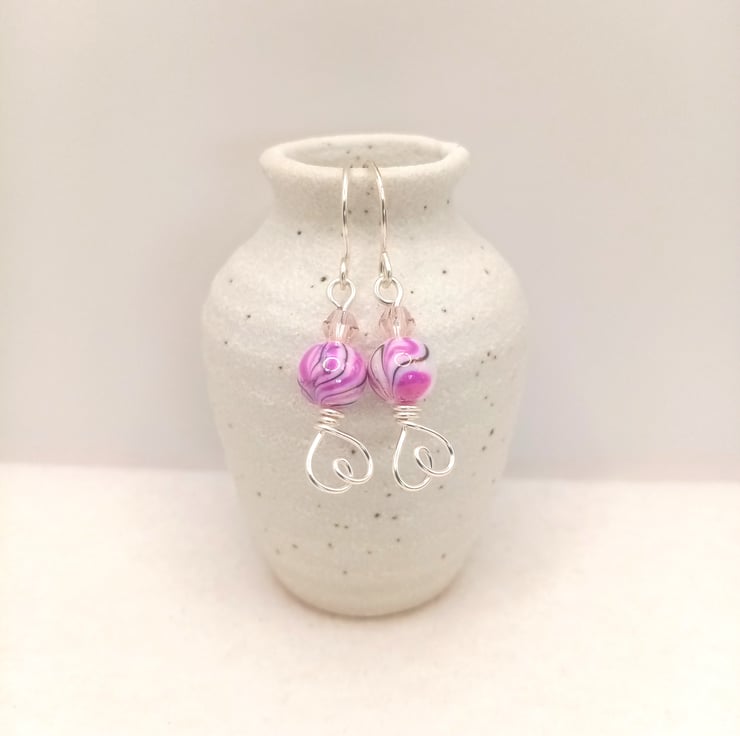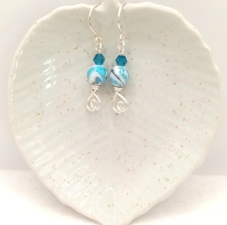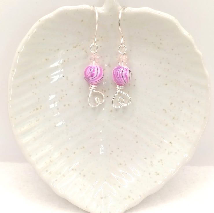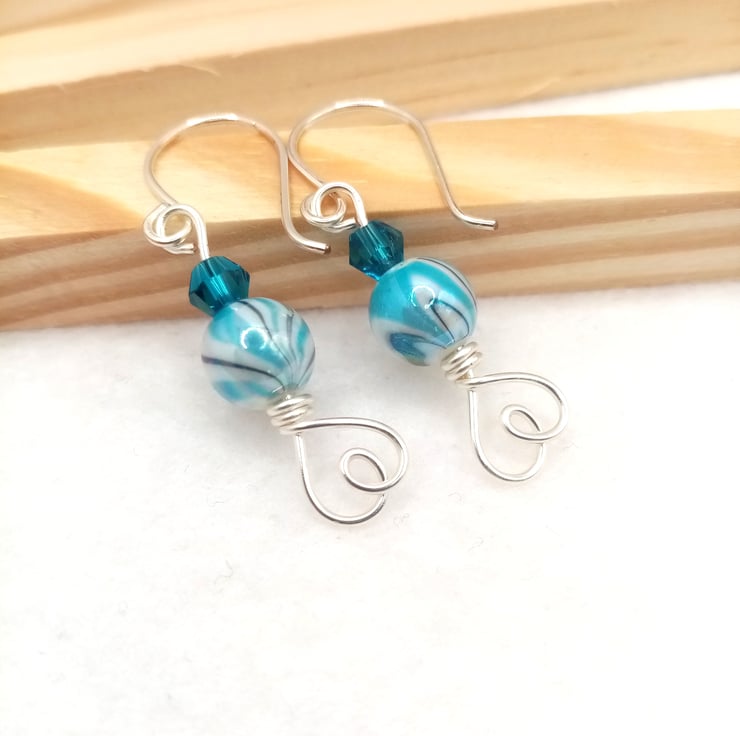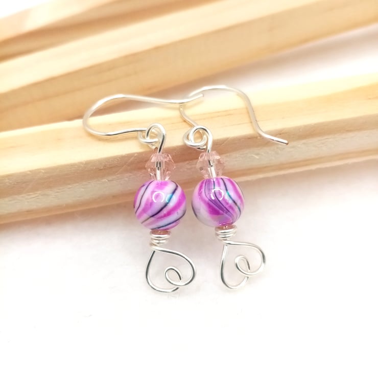These marble candy striped bead drop earrings are made using one 8mm acrylic bead and one bicone faceted crystal glass spacer bead in light pink and peacock blue and are finished off with a cute love heart design.