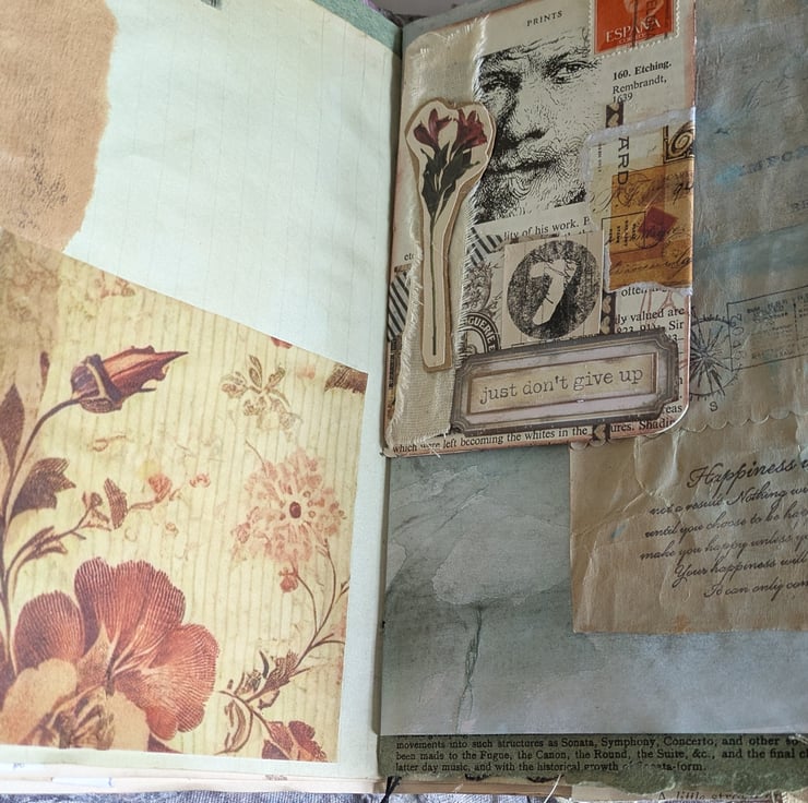 Grunge style is my favourite and this journal has lots of character.. I added some delicate hand stitching along side torn and worn ... Like life really ,that tension we all deal with .