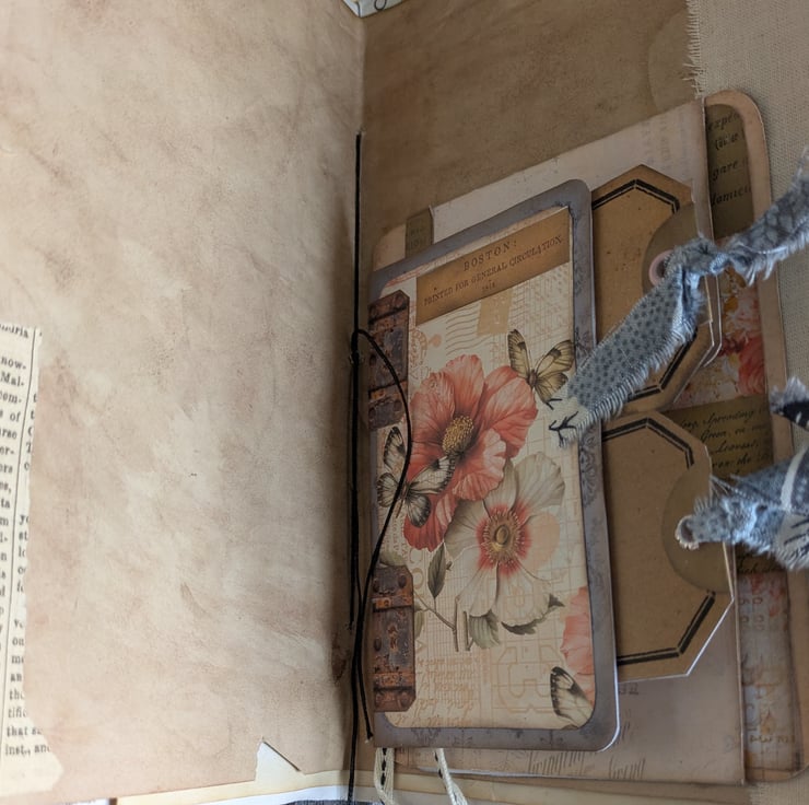 This repurposed hardback journal has been designed in a grunge style using layers of cheesecloth and hand dyed papers ..aged papers fill the inside embellished with tags ,pockets and more .. this journal closes perfectly so no need of a closure but if requested I can make one .