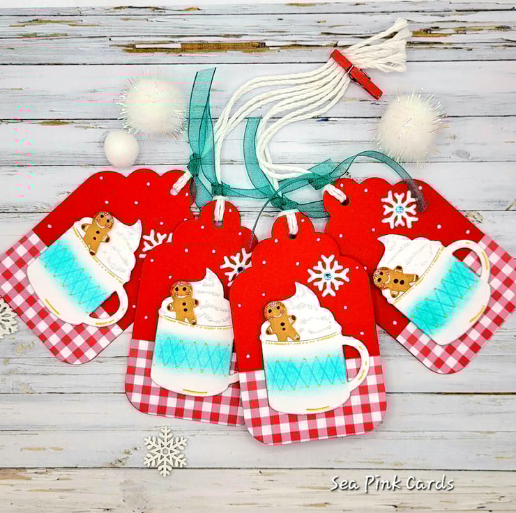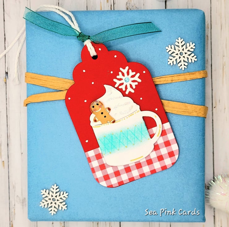I cut out the images with cutting dies and enhanced them with archival ink and pigment pens. The mugs are popped up on slim dimensional foam for 3D effect. Finished with small touches of non-shedding sparkling glitter glue, white cotton twine and a small teal organza faux bow. Decorated with a snowflake and a teal coloured shiny crystal gem and hand drawn white dots. Unique and gorgeous gift tags that would be hard to find on the high street.