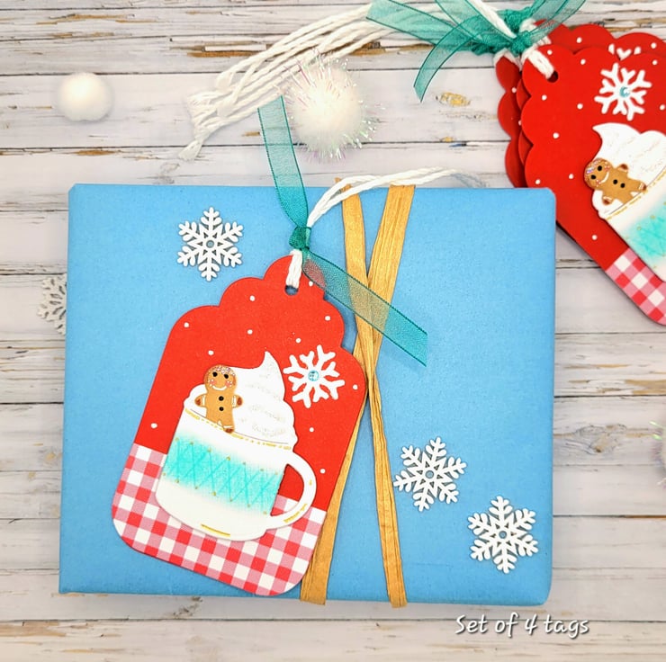 A set of four 3D, textured christmas gift tags, handcrafted with quality red card and art supplies. Featuring a mug of hot chocolate and whipped cream. There is also a mini gingerbread cookie, sparkling faux sugar and a layered, cheerful, red gingham border. Each of the tags has been individually handmade and measure 5.5 x 9 cms. They are blank on the reverse for writing.
