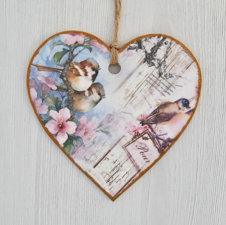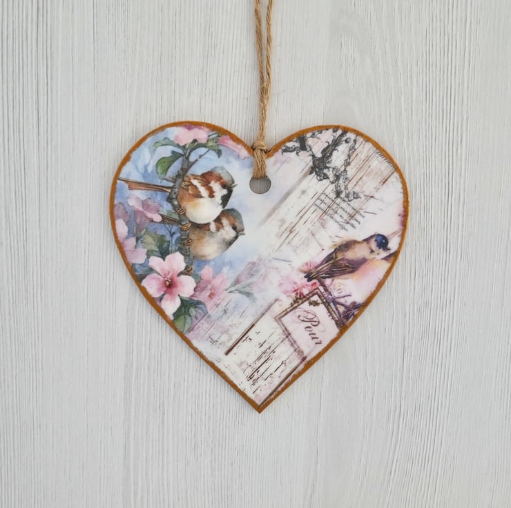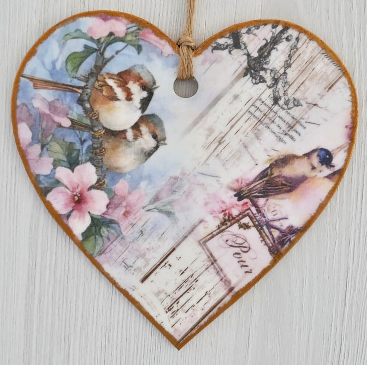 Birds & Flowers design 6” (15cm) Handcrafted Decoupaged Wooden Hanging Heart / Wall Plaque / Door Hanging.