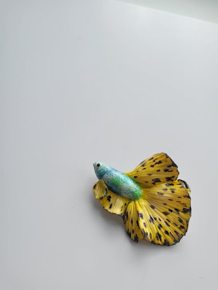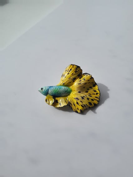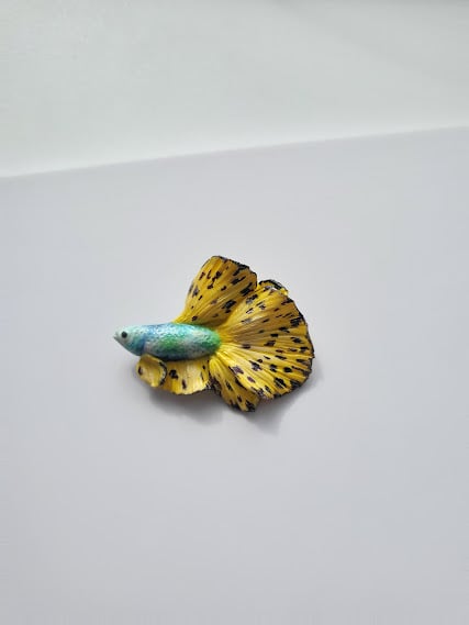 Inspired by the radiant warmth of a summer's day and the unique patterns found in nature, this handcrafted polymer clay betta fish features a striking combination of sunny yellow and deep black spots. The delicate, ruffled fins capture the graceful movement of a live betta, while its shimmering, aquamarine body adds a touch of serene elegance. Each spot is meticulously hand-painted, making this wearable art a one-of-a-kind statement piece. A perfect gift for fish lovers, or a vibrant accessory to brighten up any jacket, bag, or hat.