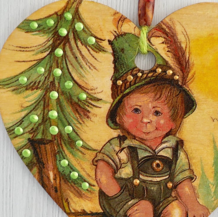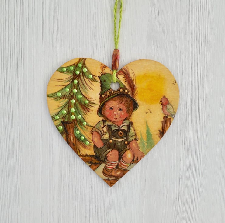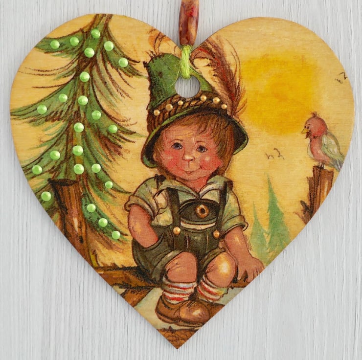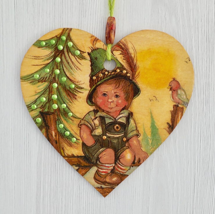 Decoupaged Wooden Hanging Heart: Tyrollean design 6” (15cm)