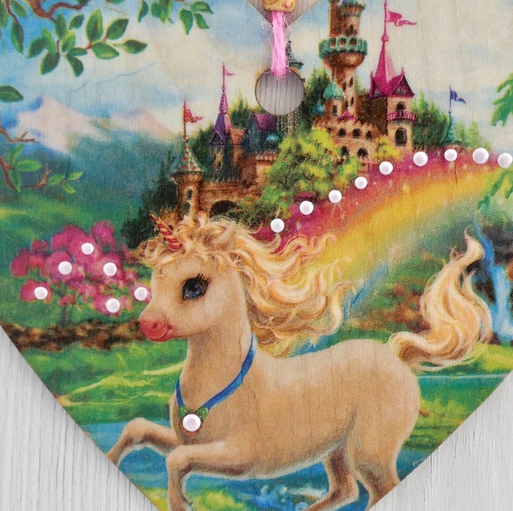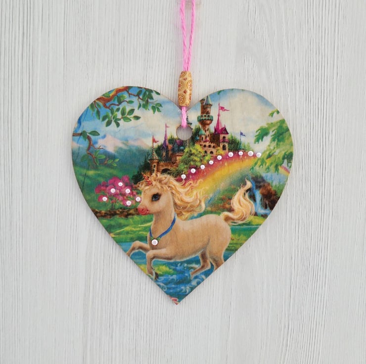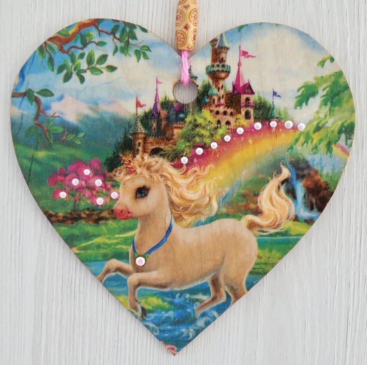Unicorn Castle 6” (15cm) Handcrafted Decoupaged Wooden Hanging Heart / Wall Plaque / Door Hanging.