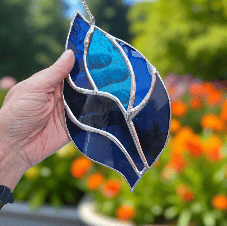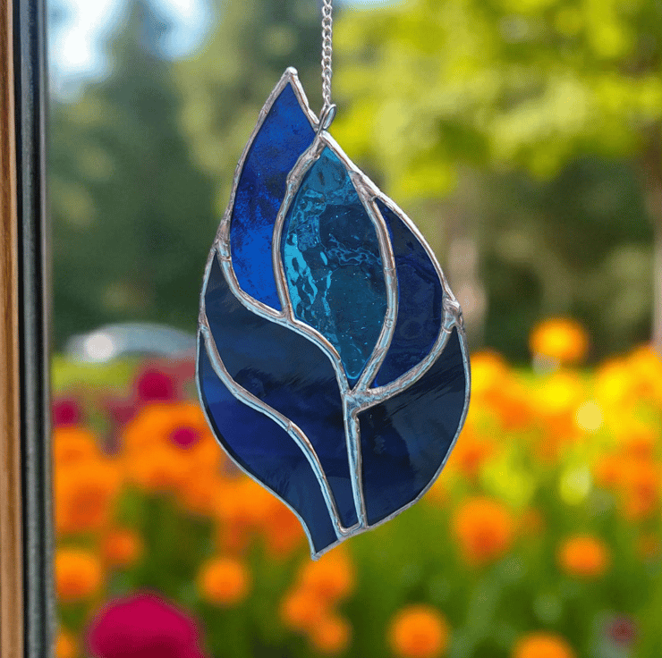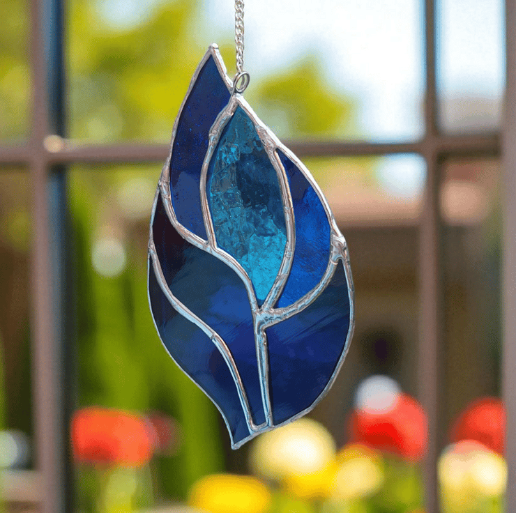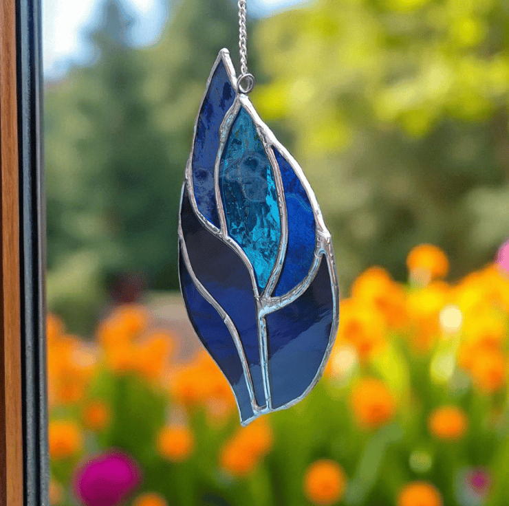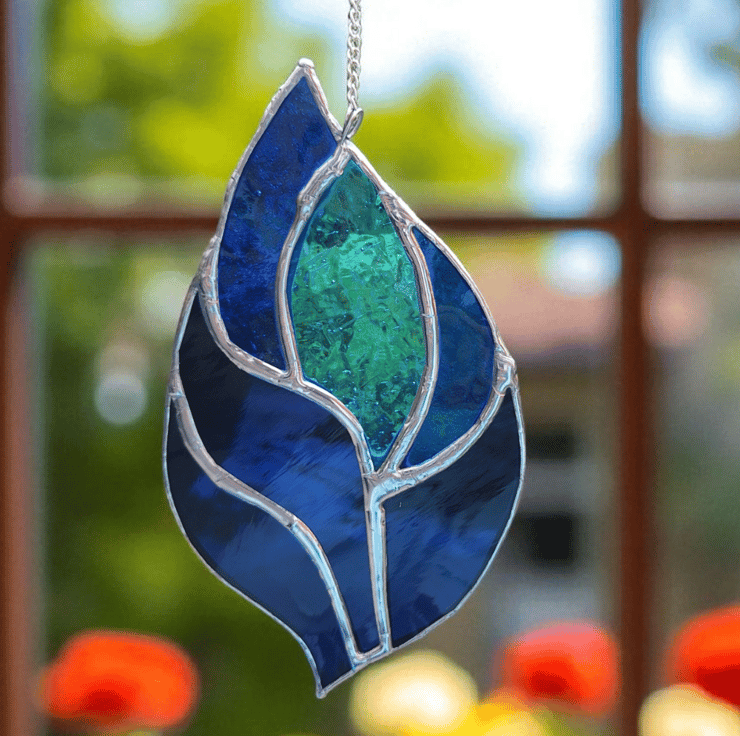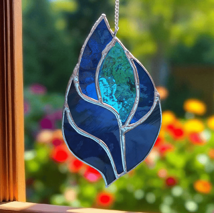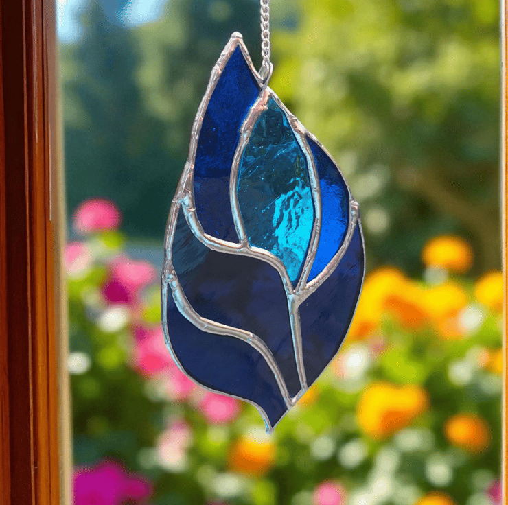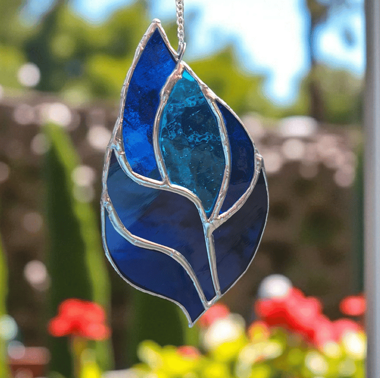 This vibrant blue stained glass suncatcher is handmade using the traditional Tiffany copper foil method, bringing colour and joy into any space.