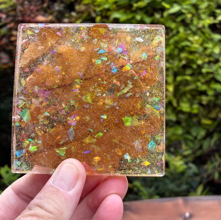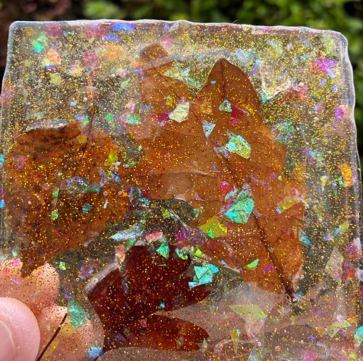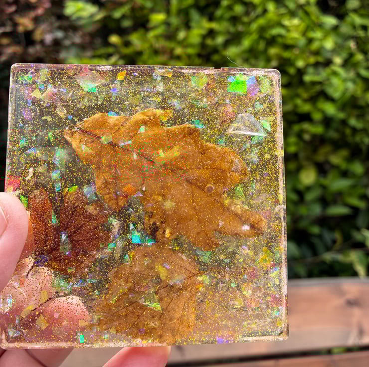 Set of two square resin coasters with dried leaves and holographic glitter