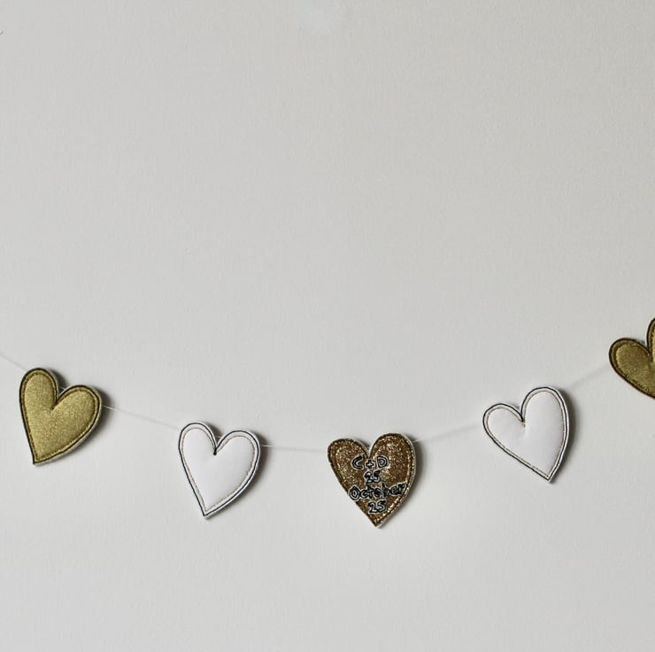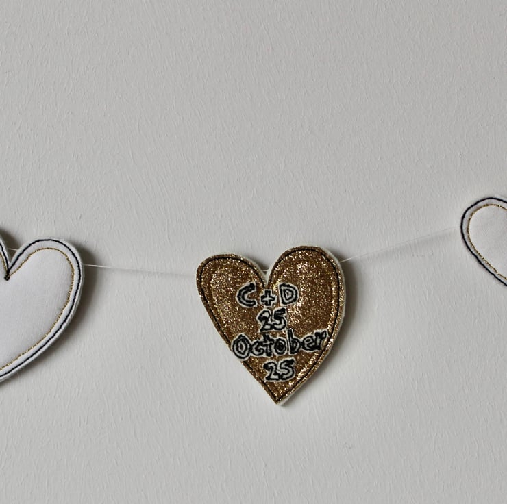 A handmade heart garland personalised with 'C plus D 25 October 25'.