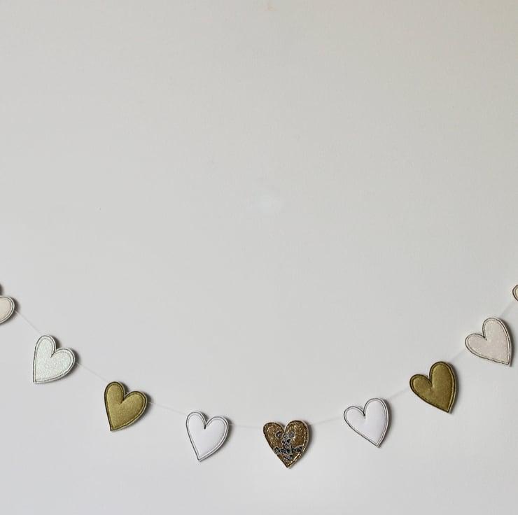 Each of the fifteen hearts suspended along this garland, is sewn using a combination of 100% wool felt, cotton cloth, glitter cloth and free hand machine embroidery; multiple layers of cloth are sewn together and cut out by hand using very sharp scissors.