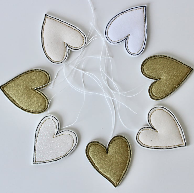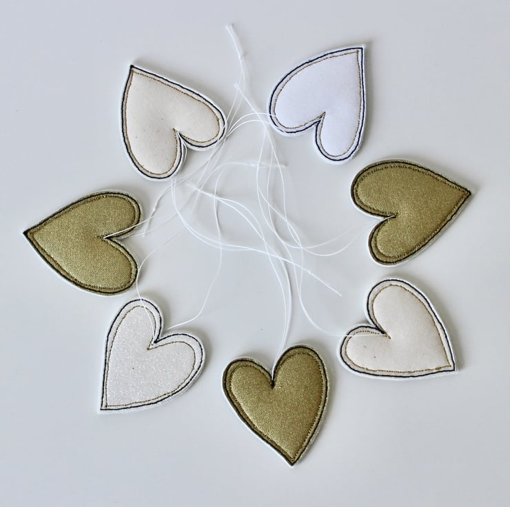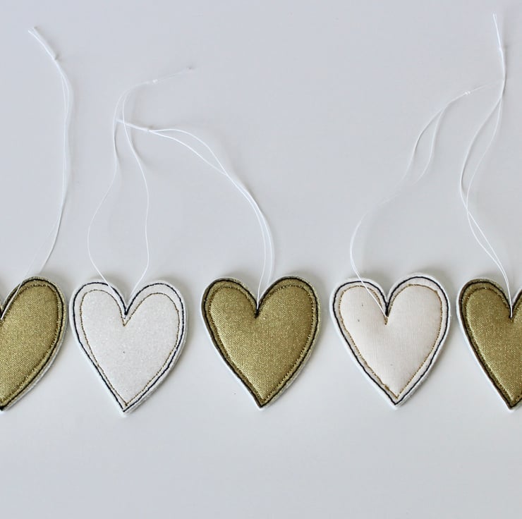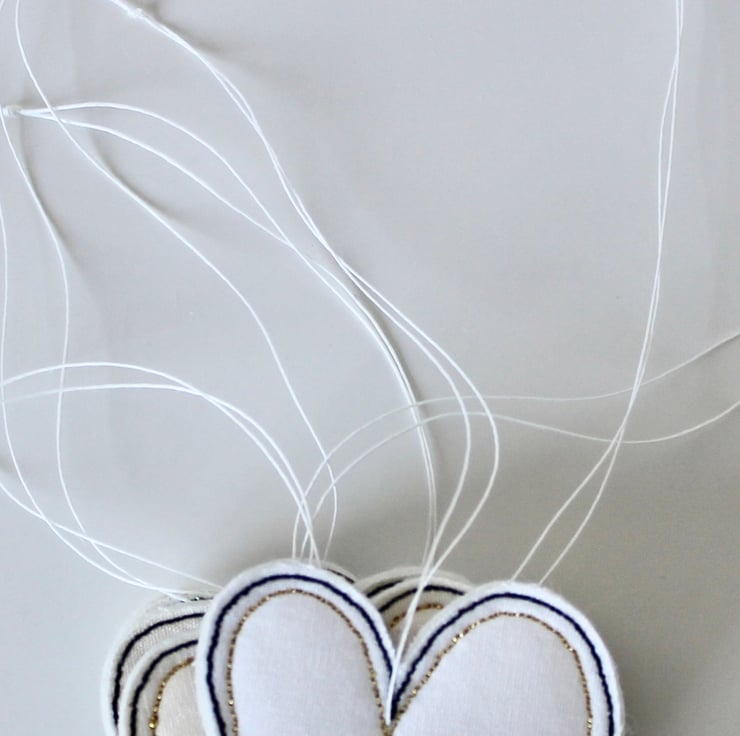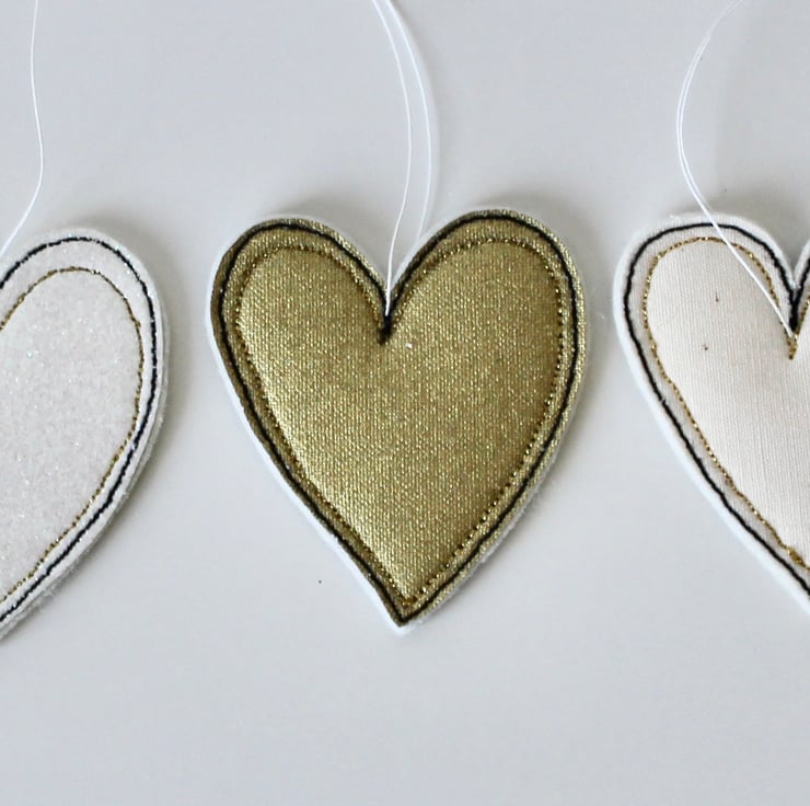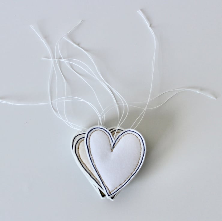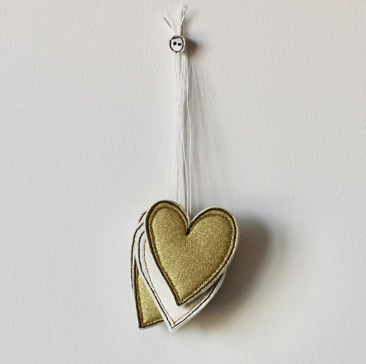 Each heart is sewn using 100% wool felt, cotton cloth and free hand machine embroidery; multiple layers of cloth are sewn together and cut out by hand using very sharp scissors. With a linen string to suspend.
