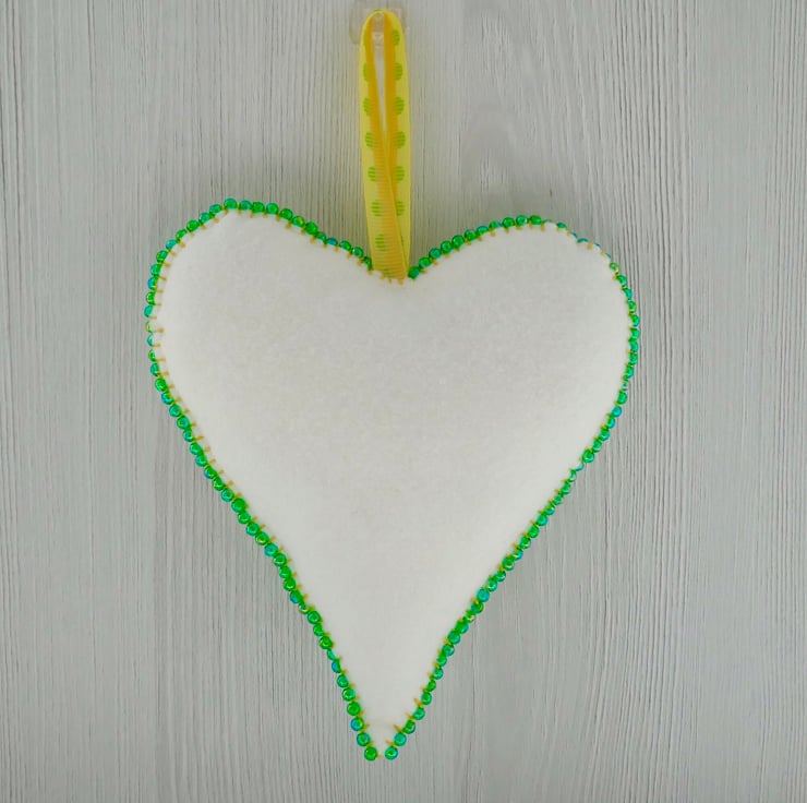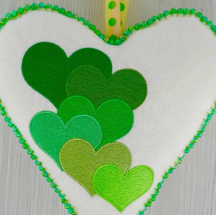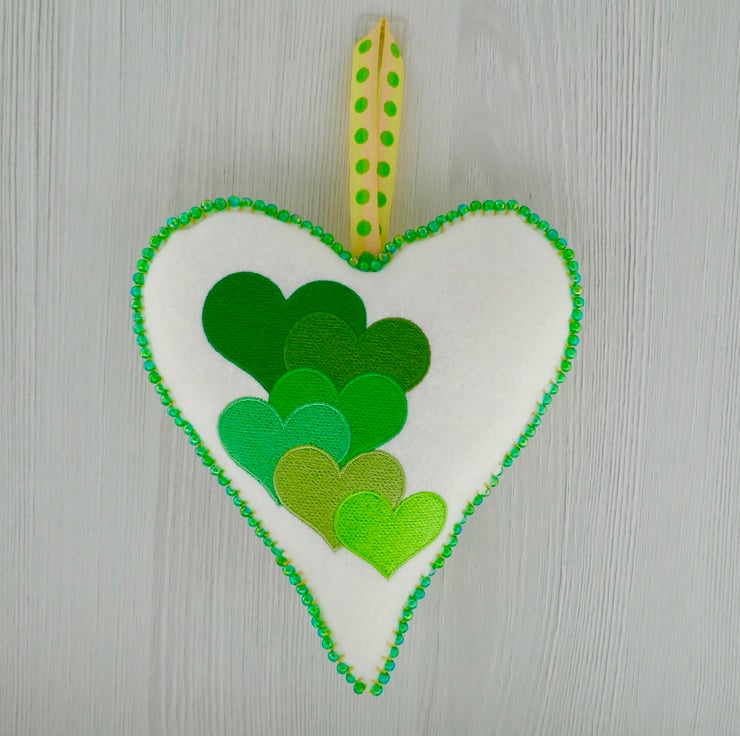 Green Hearts design Embroidered Felt Hanging Heart with beaded edge, on a Light Cream background.