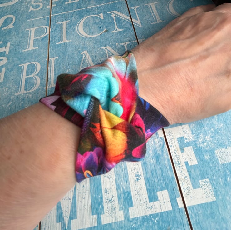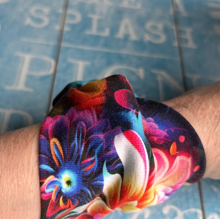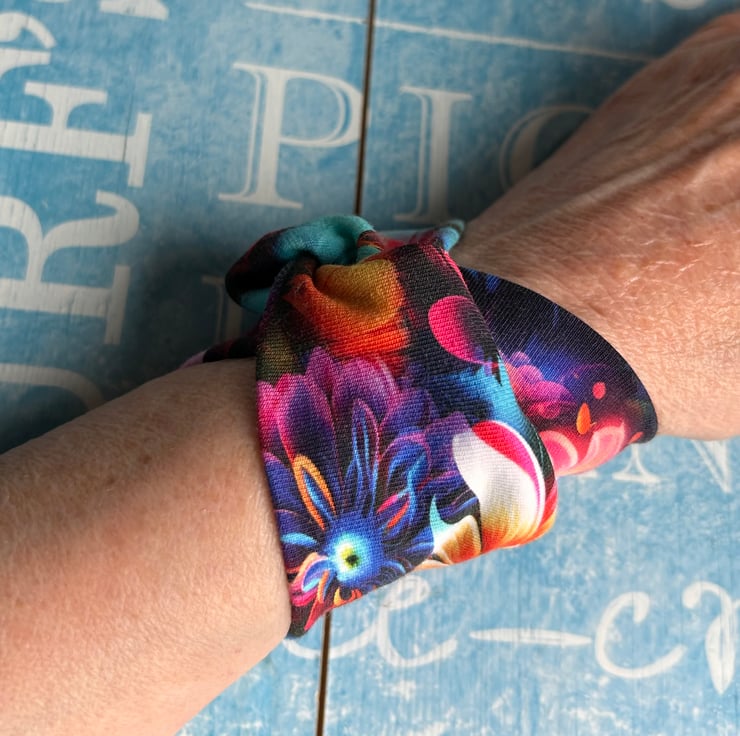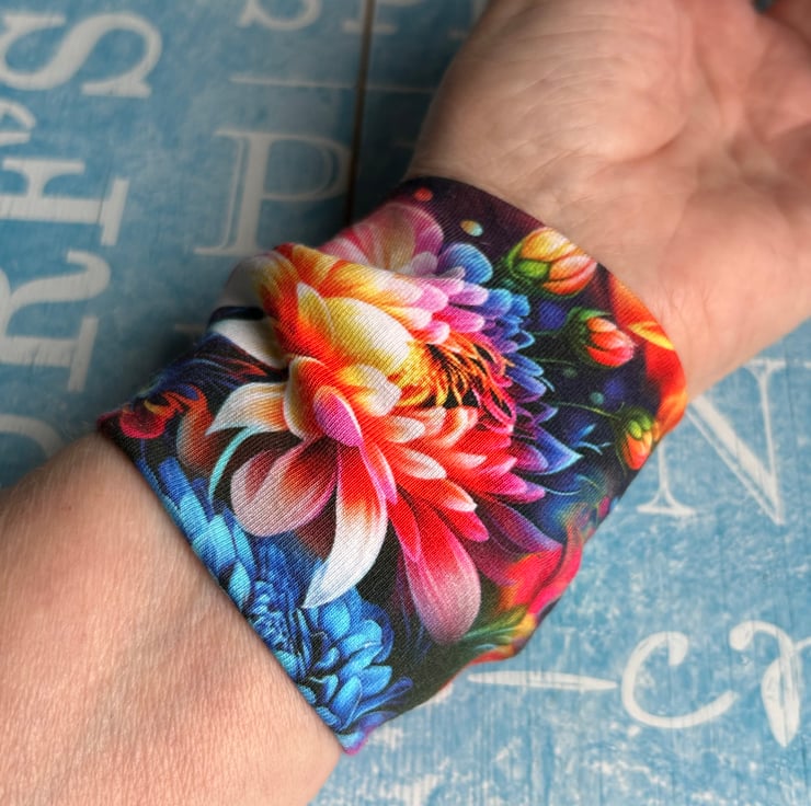 A stunning floral twist fabric cuff bracelet with a very tropical vibe. Perfect for the summer. Easy to slip on and a great way to discreetly hide your wrist for when needed.