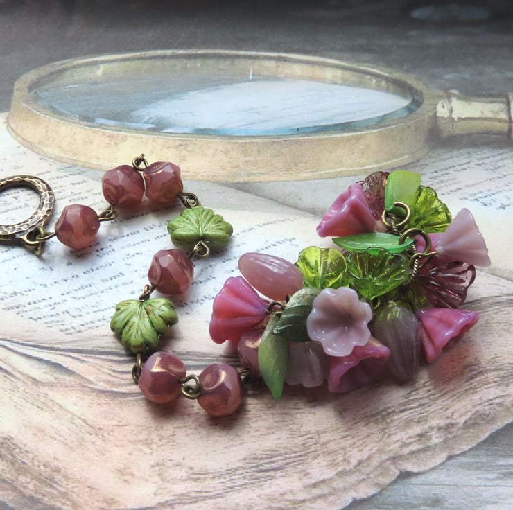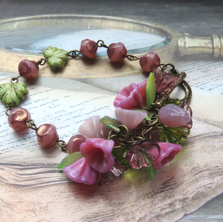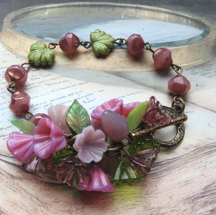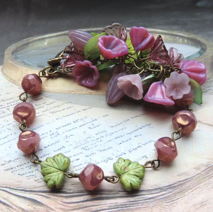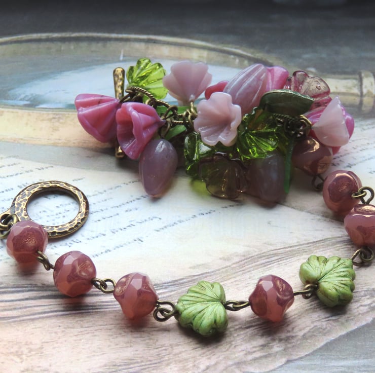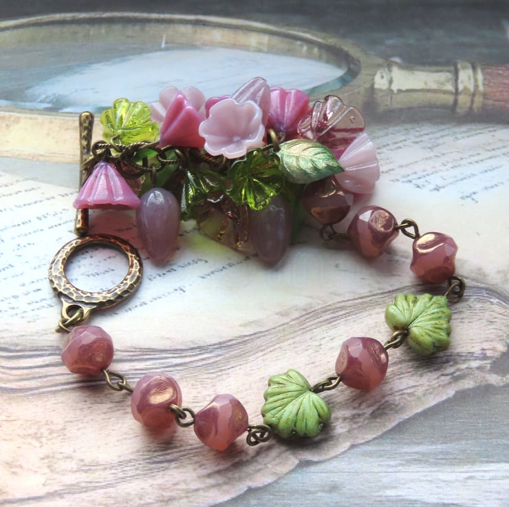 This lovely bracelet features vintage glass flower beads and hand painted leaves attached to an aged gold chain. They are in shades of dusky rose, and green. This is teamed with lovely quality dusky rose Czech glass baroque beads and light green Czech glass maple leaves. It fastens with a Tierracast brass toggle clasp.