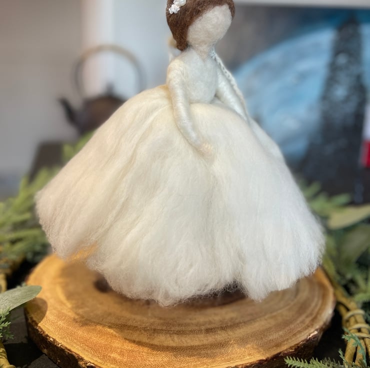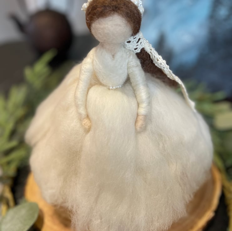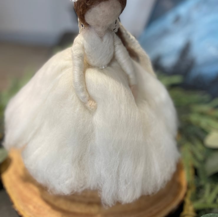 Celebrate love and new beginnings with this beautifully handcrafted wool felted bride. Made with soft natural Merino and Corriedale wool, each bride is lovingly shaped by hand, capturing the delicate elegance of a wedding day.