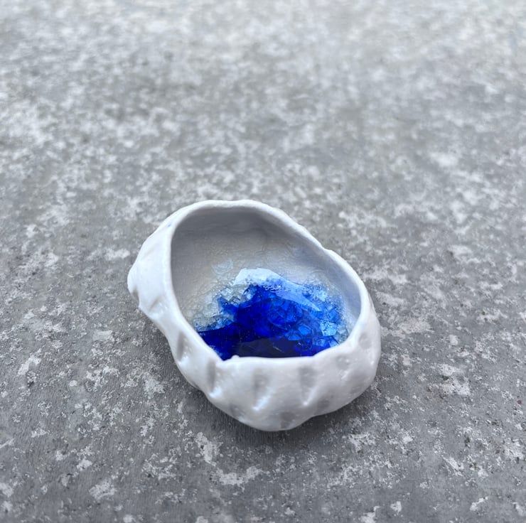 Inspired by the Geode this piece is hand formed and shaped from porcelain. The texture is hand carved adding each mark individually with various tools. It is then bisque fired before being filled with my cobalt and diamond crackle glaze. The final glaze firing to 1,260 degrees transforms the piece into the vibrant piece you can see in the pictures.