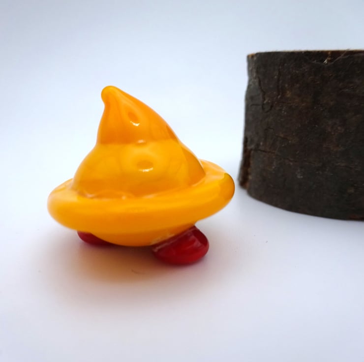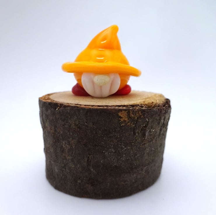 A small glass gnome figure made by hand using a technique called lampworking.