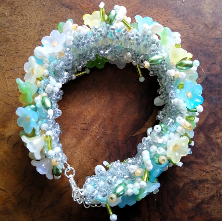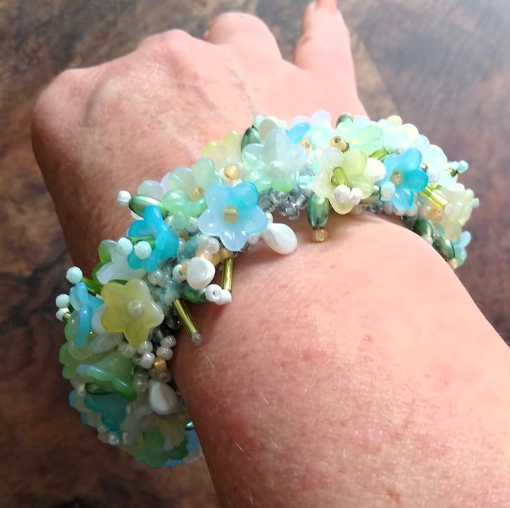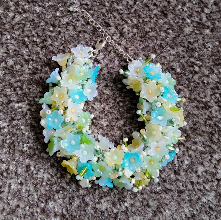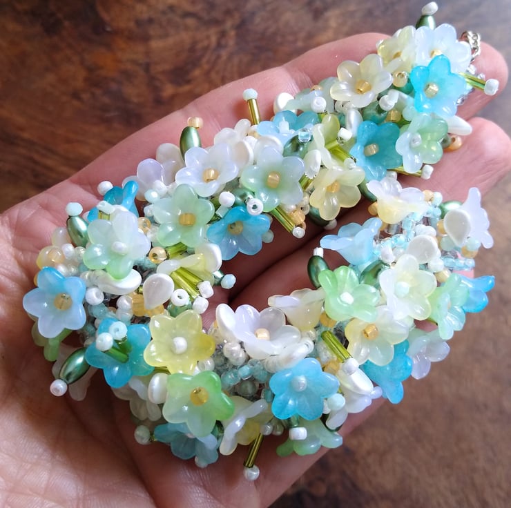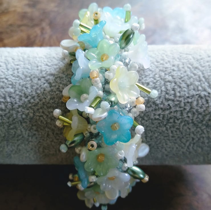 Add a touch of vintage romance to your day with this eye catching handmade lucite beaded flower corsage bracelet. Featuring a dreamy palette of pastel blue, lemon yellow and minty green, each bloom is sculpted in glossy lucite for a radiant, dimensional finish. This statement floral design, inspired by retro bridal corsages, evokes mid century glamour and elegance.