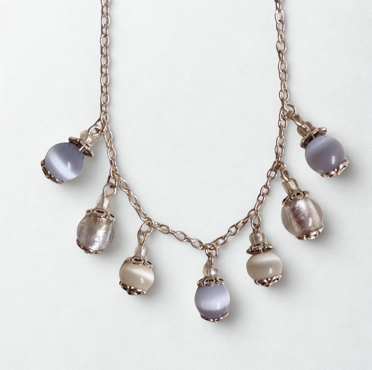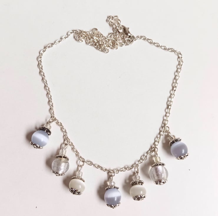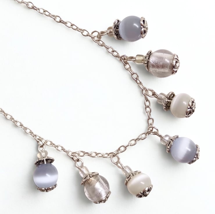 Gorgeous luminous ombre glass beads with a gradient of colour shifting from deep to mid to light grey to white to a silvery luminous eye catching bright white which circles the orbs lke their own atmosphere. These beautiful beads are blended with Tibetan silver and tiny glass beads and hang on tiny strands dotted around the silver plated chain. In between the ombre beads are tiny strands of pearlised barrel beads and shallow ombre beads combined again with decorative Tibetan silver spacers and tiny glass beads. The chain is approx 47 cm (18") long and has a lobster clasp fastener. This unique necklace is perfect for special occasions, wedding days, parties, for any special event.