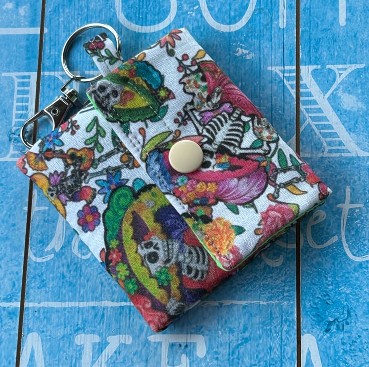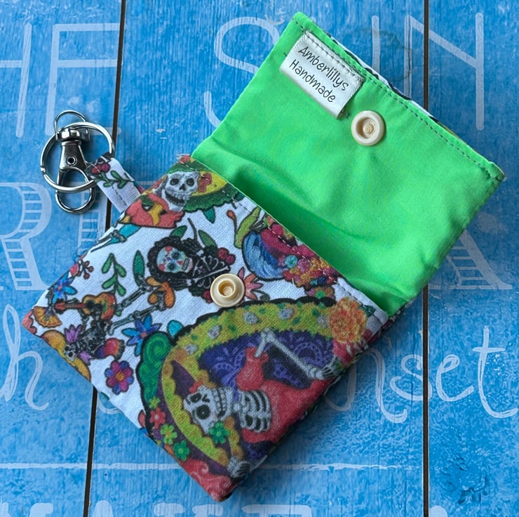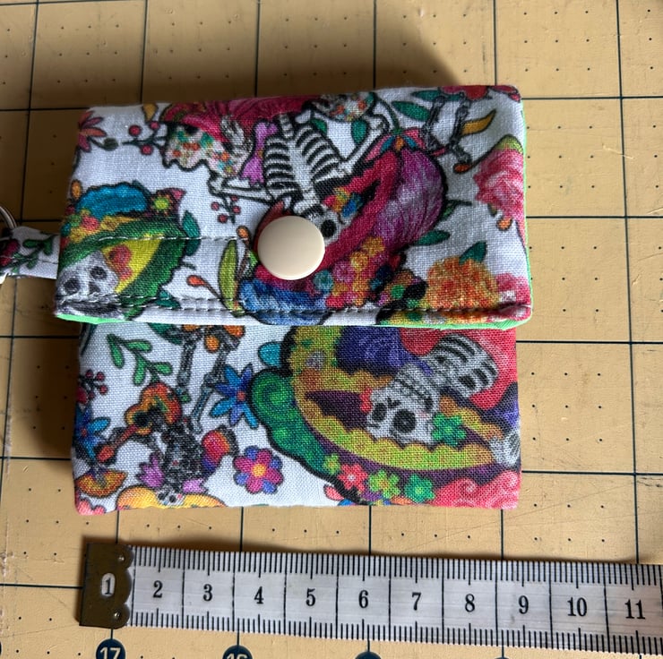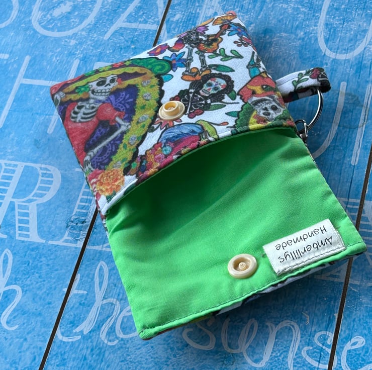The fabric design is day of the dead and bright lime green for the lining. Finished off with a peachy beige snap clasp.