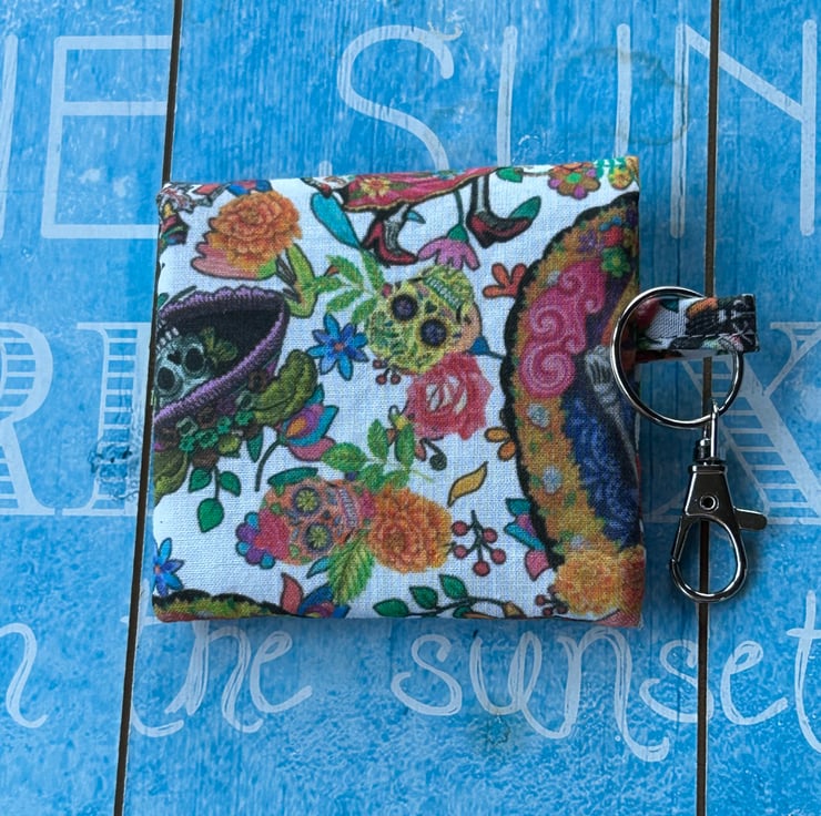 Ear bud pouch or keychain pouch for bag skull design skeletons fabric