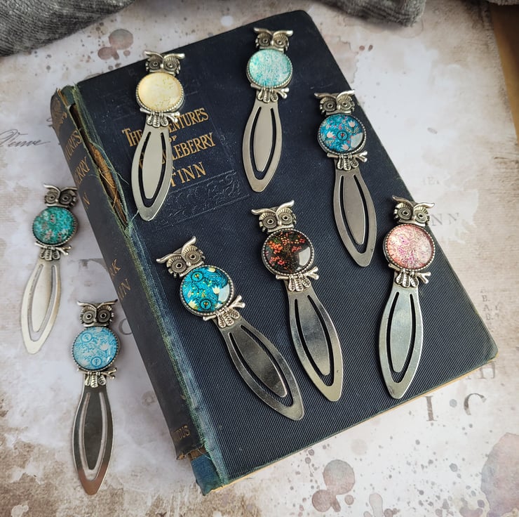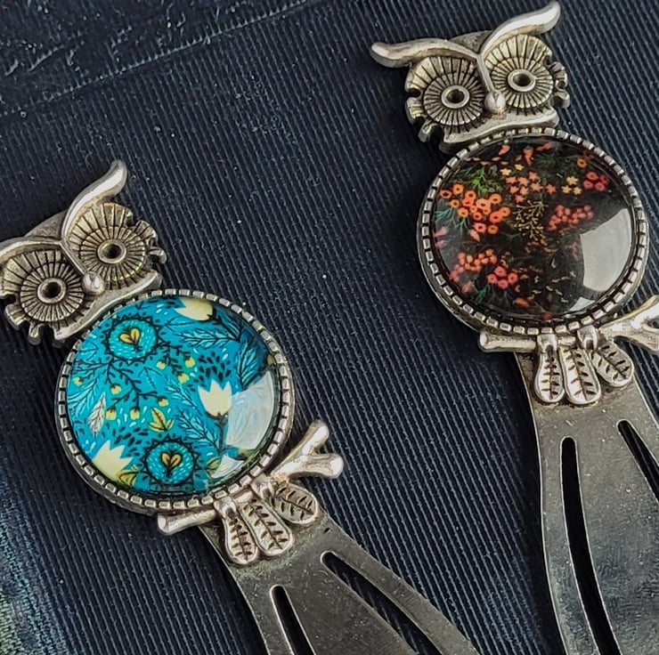 Beautiful owl bookmarks in silvertone metal, each with a pretty glass cabochon embellishment as the owl's body.
