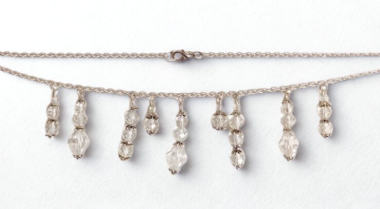 Beautiful faceted glass beads combined with decorative Tibetan silver in multiple tiny, carefully crafted threads which hang on a silver chain, approx 47 cm (18") long. The faceted glass catches the light both inside and out in a subtle and yet eye catching way. This necklace is elegant and lightweight and is made to complement a bride's decolletage on her special day. Please note the earrings on the photographs are not included with the necklace and are listed separately just because somebody may want to buy them or the necklace on their on their own. They are listed as Light Catching Bridal Earrings.