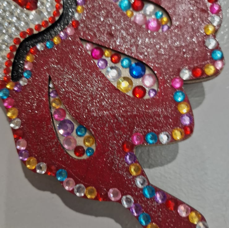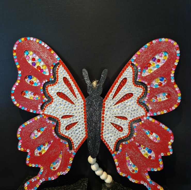 A wooden butterfly, hand decorated with acrylic and sequins. Measuring 9x8 inches, approx. Decorated with red acrylic paint and hand decorated with multi coloured sequins.