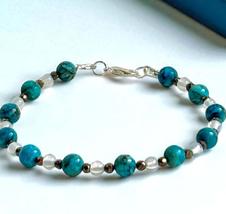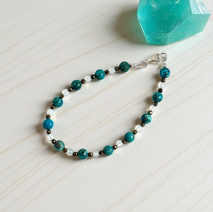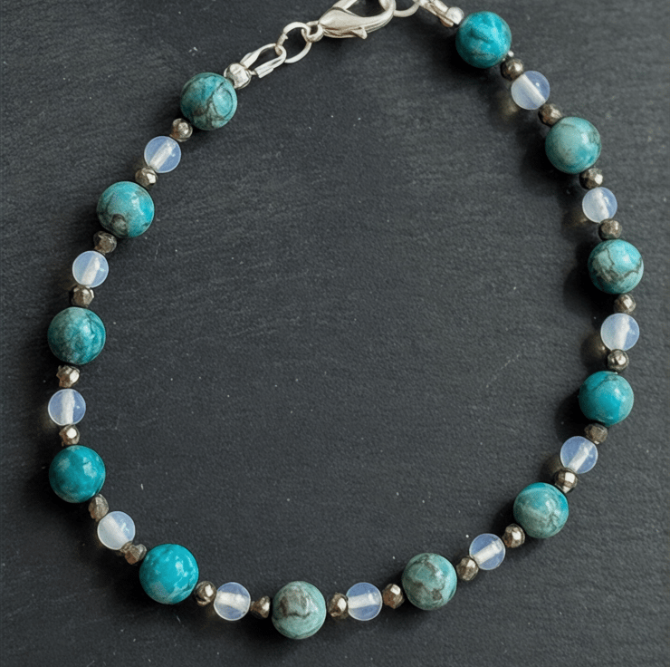 Discover the allure of this handmade bracelet crafted with 6mm South African Turquoise beads. This stunning piece is accented with shimmery 4mm Opalite and 3mm Pyrite beads, creating a captivating play of colours and textures. Made to fit a standard ladies wrist which is 7” it fastens with a silver tone lobster clasp, it’s an elegant accessory perfect for gifting or treating yourself. Will be gift wrapped in pretty Tissue paper and an organza gift bag.