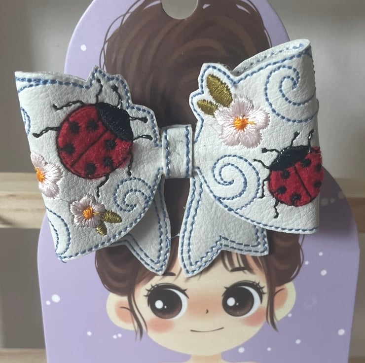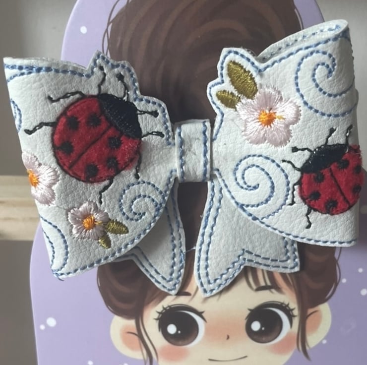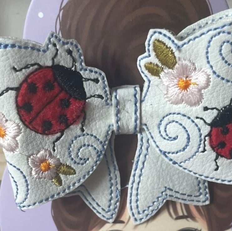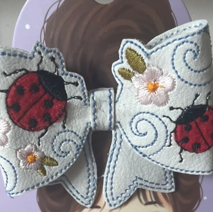 Bring a pop of colour and a touch of nature to your hairstyle with this beautifully handmade faux leather bow. The intricate embroidery features bright red ladybirds, delicate pink blossoms, and elegant swirling details – perfect for spring and summer.