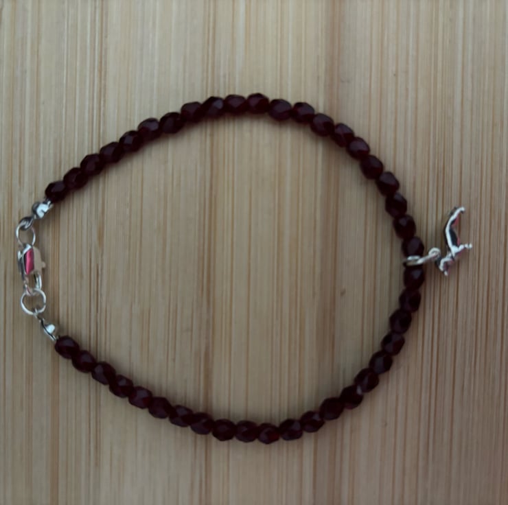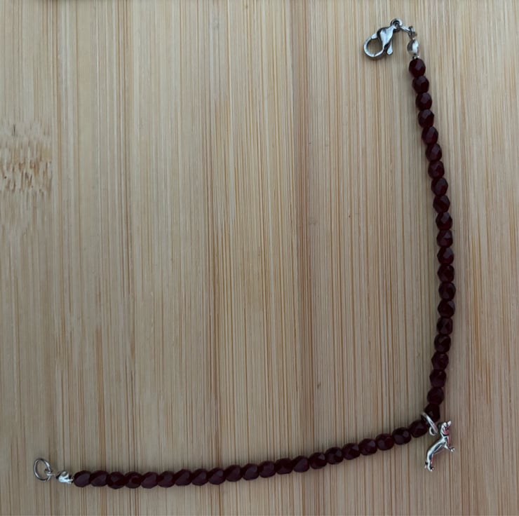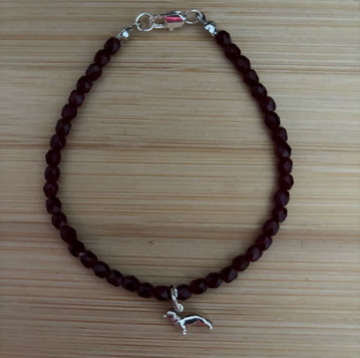 Ruby red and sterling silver dachshund charm bracelet made with a silver jewelry wire and with clasp fastening (20cm in length)