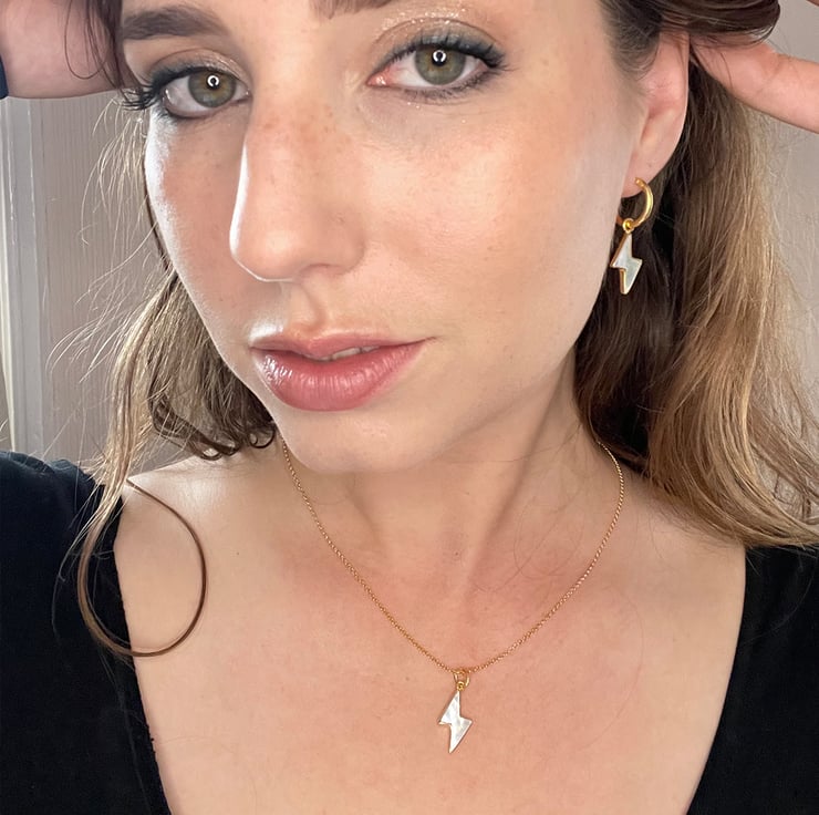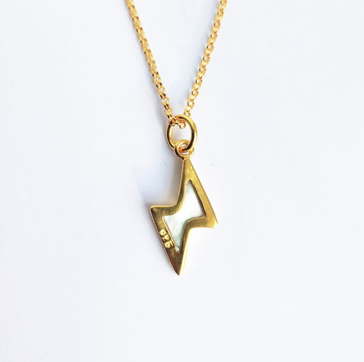 Our oyster shell walls are as much fun to use as the pearls inside, so for this necklace we cut the Mother of Pearl into a lightning bolt shape and encased it in a simple bezel setting to showcase the design.
