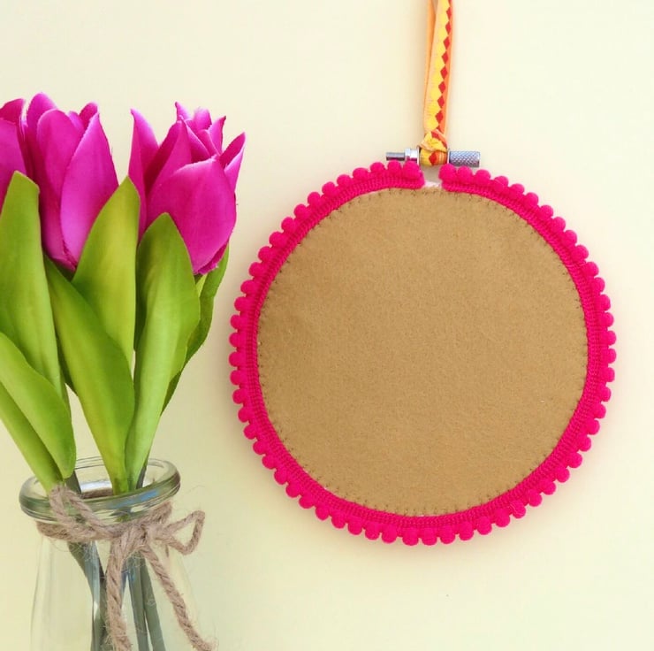 PomPom edged bamboo hoop frame, Ribbon hanging loop
