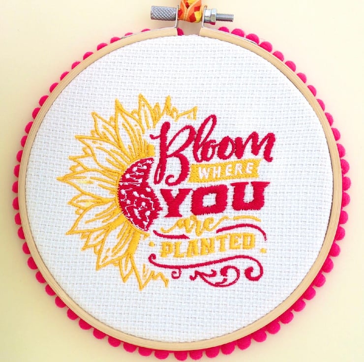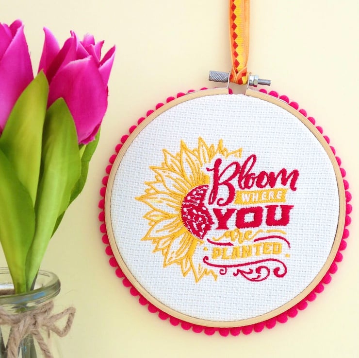 A machine Embroidered Hoop Wall Hanging, with a Yellow sunflower and the words: Bloom where you are planted in Cerise and Yellow thread. Decorated with Cerise PomPom trim.
