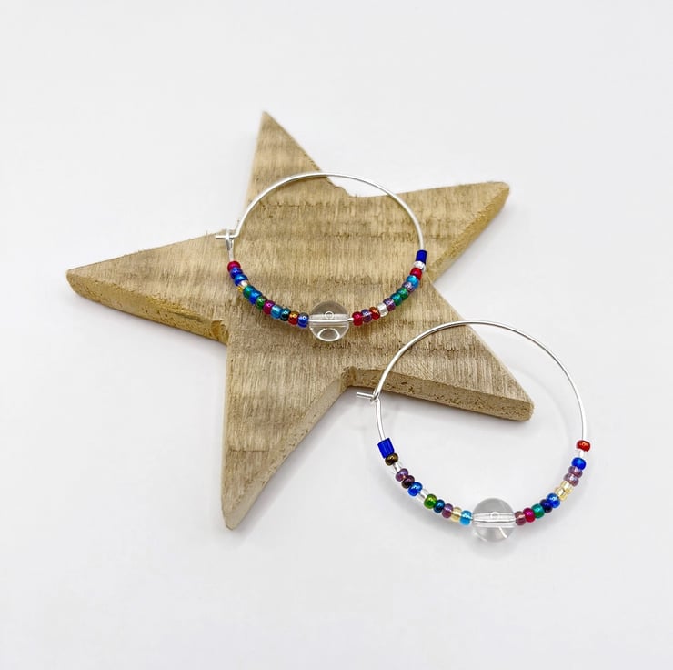 Sterling Silver Hoops with Crystal Bead and Rainbow Mix Seed Beads - 30mm