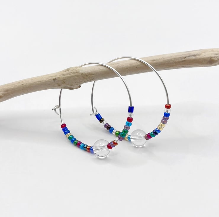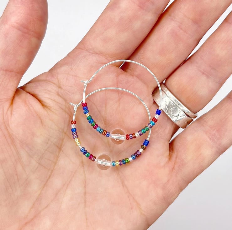 Larger sterling silver hoop earrings with a clear crystal bead and a rainbow mix of tiny glass seed beads.