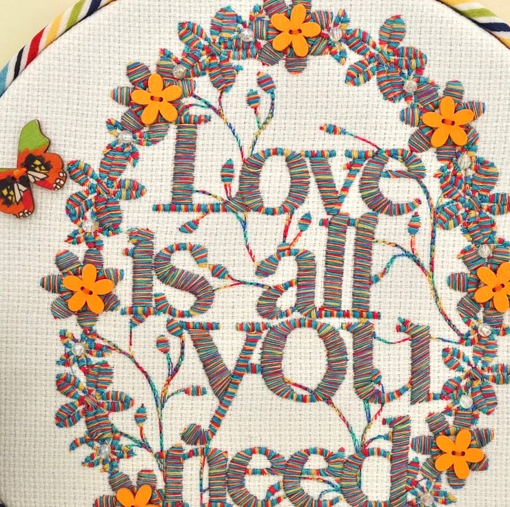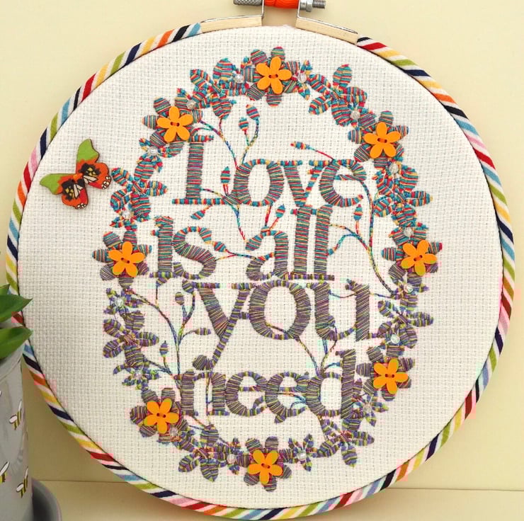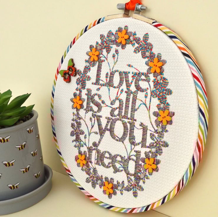 A machine Embroidered Hoop Wall Hanging, with a floral border and the words: Love is all you need, in Blue mix variegated thread. Decorated with Orange wooden button flowers and butterfly.